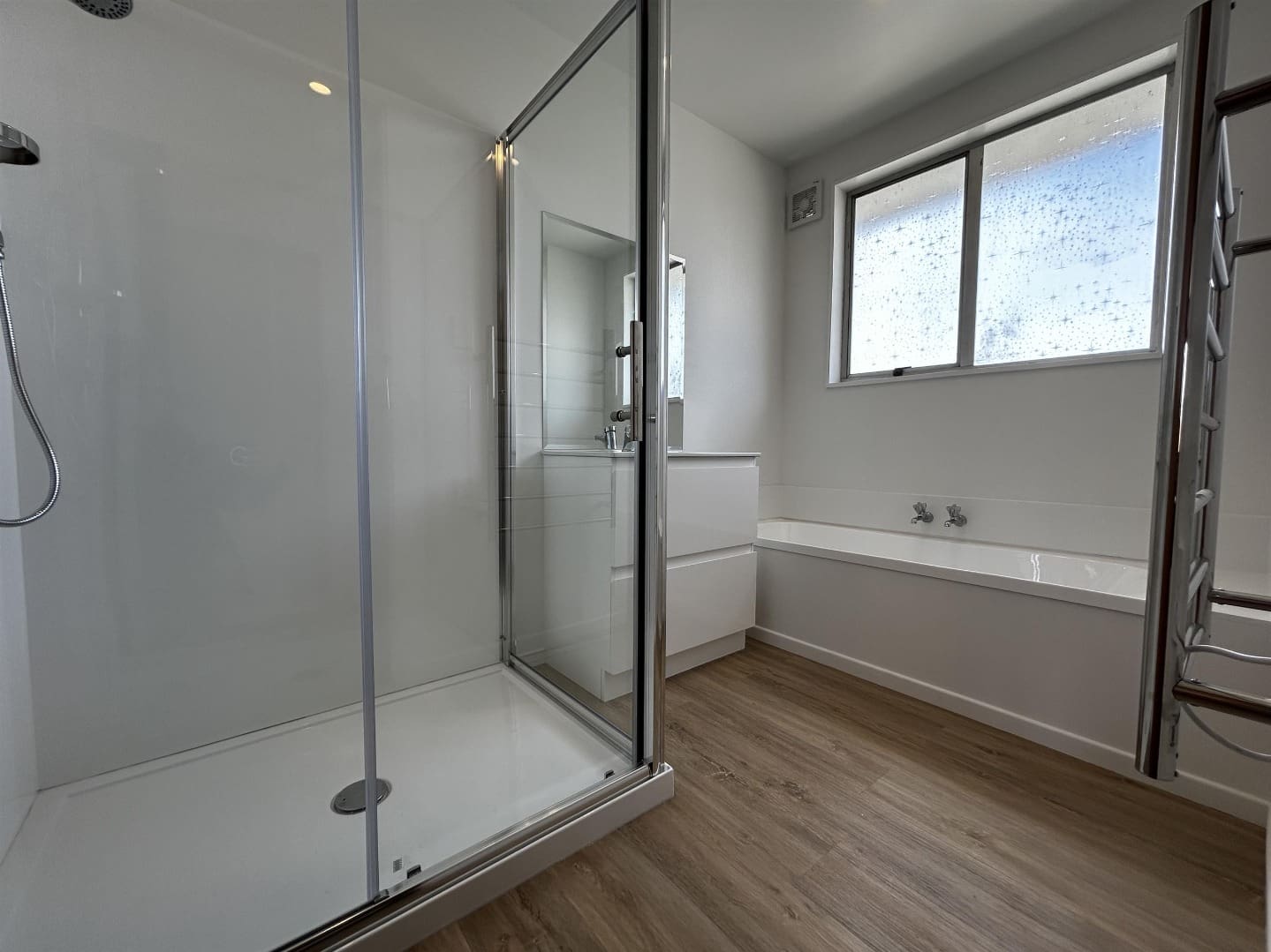 Bathroom with a standalone shower, bath, vanity, extractor fan, and heated towel rail.