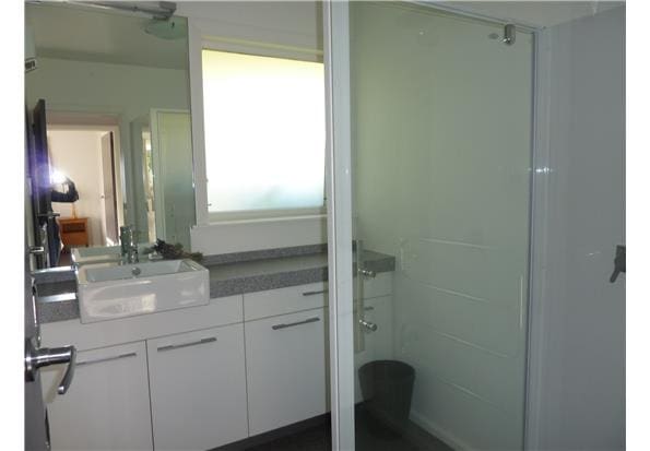 – Contemporary bathroom with stand alone shower, vanity, towel rail and extractor fan.