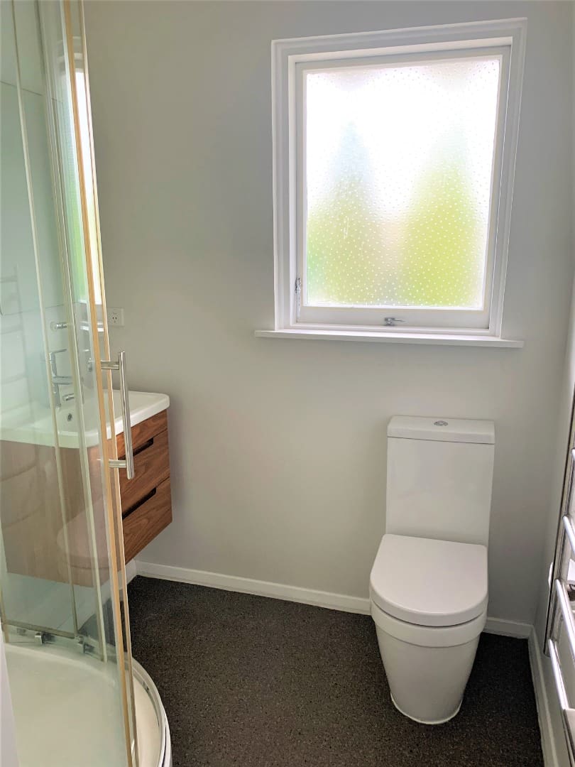 – Modern bathroom includes shower, toilet, vanity and heated towel rail.