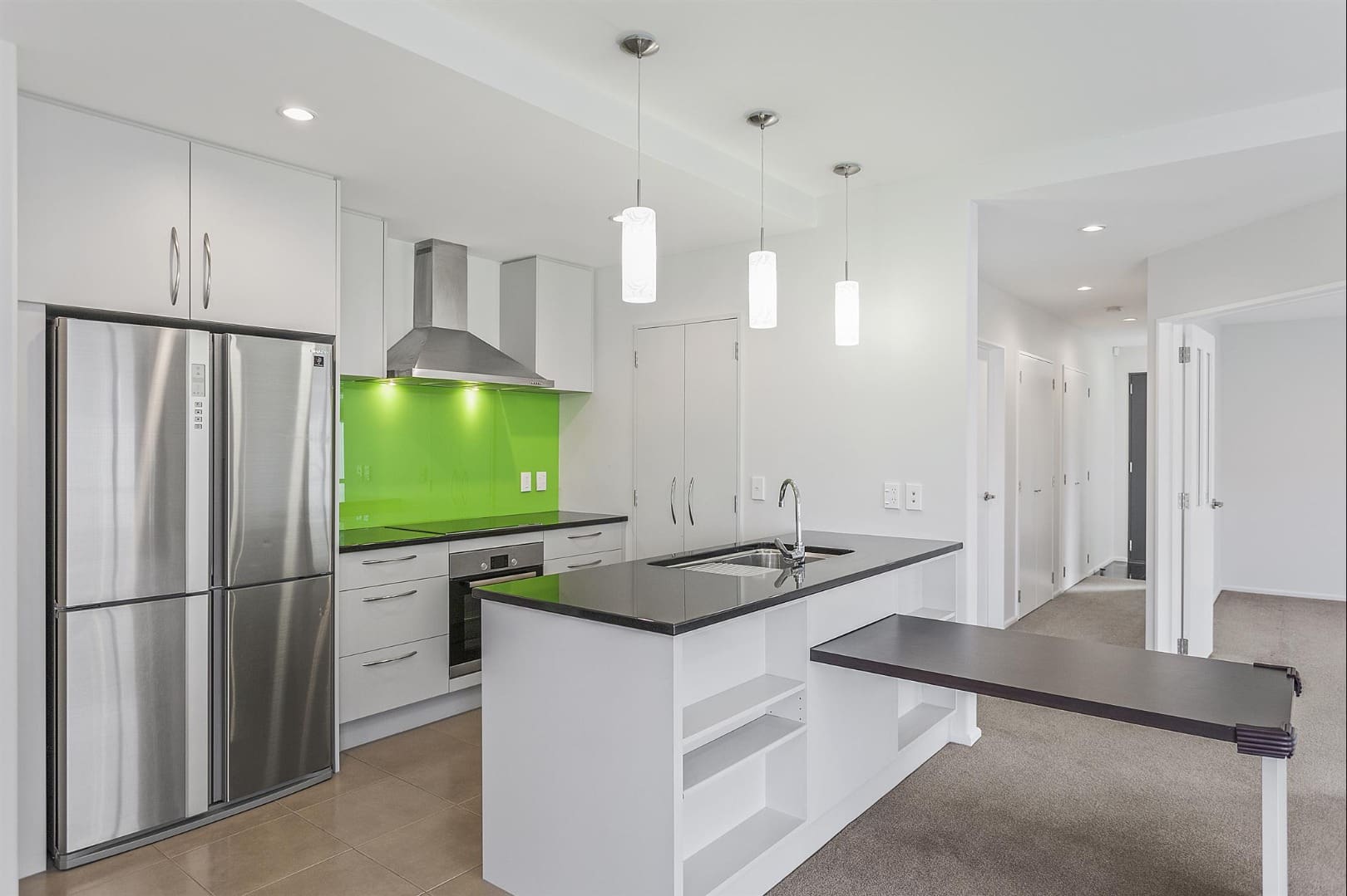 Modern kitchen featuring an induction cooktop, wall oven, separate pantry, excellent storage, and a double fridge/freezer (included).