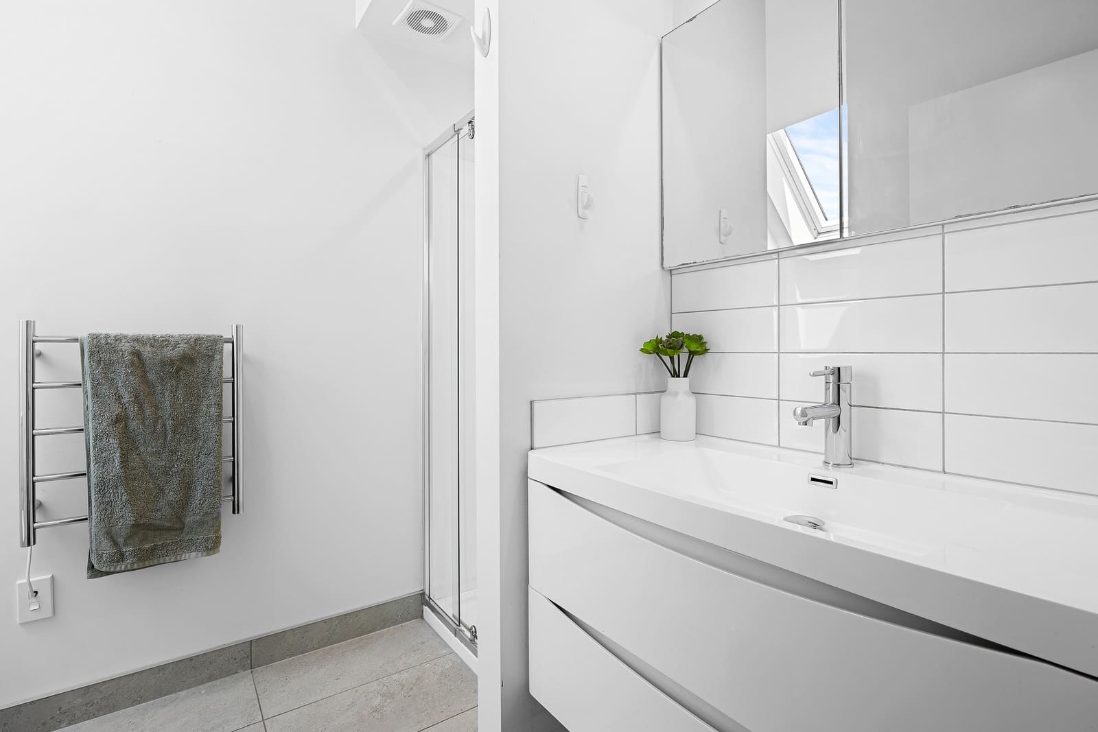 – Stylish bathroom upstairs with a shower, large vanity, toilet, and extractor fan.