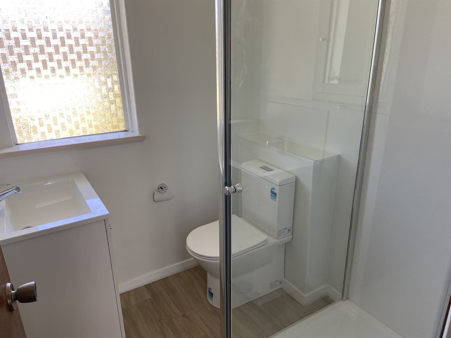 – Refurbished bathroom has a shower, hand basin and toilet.